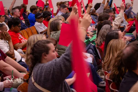 That organizing effort led a majority of board members to agree to a public conversation with educators and parents in April. At Carver High School, educators filled the auditorium, raising red and green cards to signal their views as board members responded to union demands.